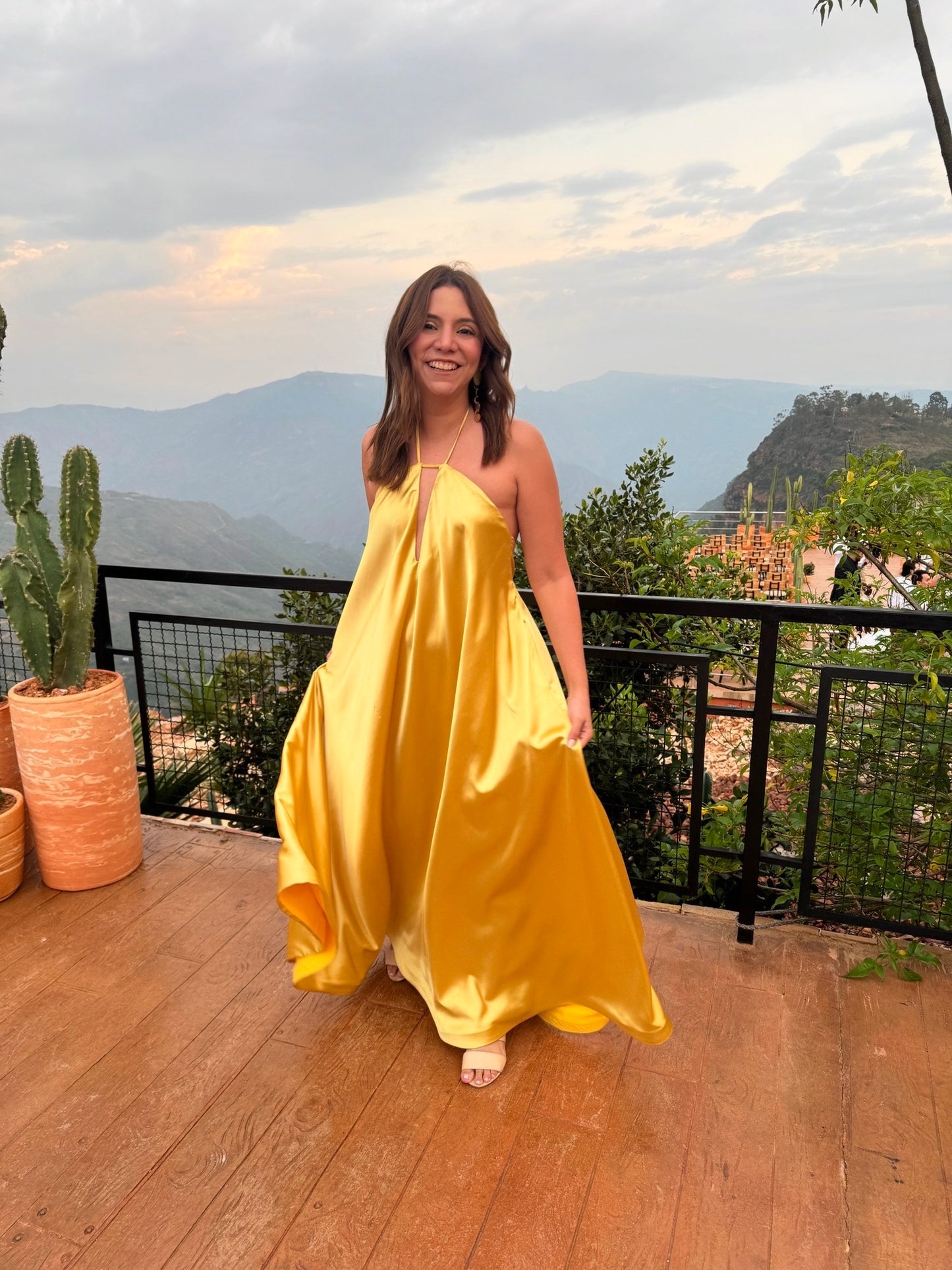 Vestido de silueta amplia con espalda descubierta, con forro. Elaborado en seda italiana.