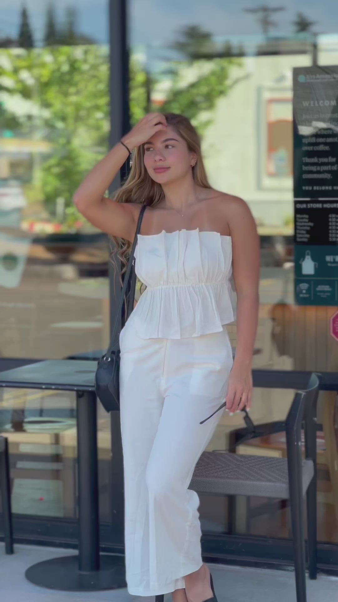 Set elaborado en lino olan, conformado por un culotte (pantalón hasta el tobillo) junto a un straple plisado, que se ajusta a tu cuerpo.